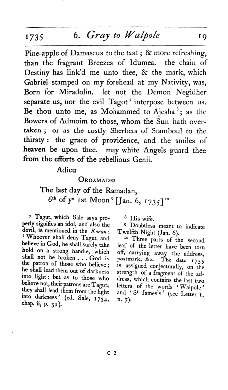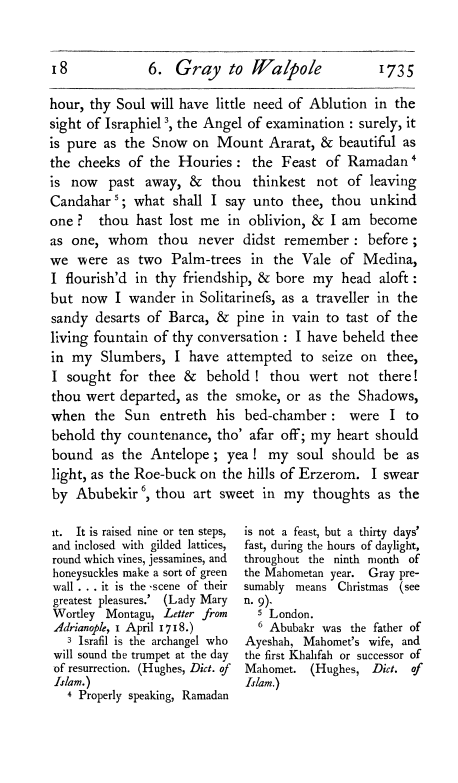 - The Yale Edition of Horace Walpole's Correspondence. Ed. by W. S. Lewis. New Haven, Conn.: Yale UP; London: Oxford UP, 1937-83, vols. 13/14: Horace Walpole's Correspondence with Thomas Gray, Richard West and Thomas Ashton i, 1734-42, Horace Walpole's Correspondence with Thomas Gray ii, 1745-71, ed. by W. S. Lewis, George L. Lam and Charles H. Bennett, 1948, vol. i, 70-72