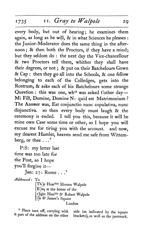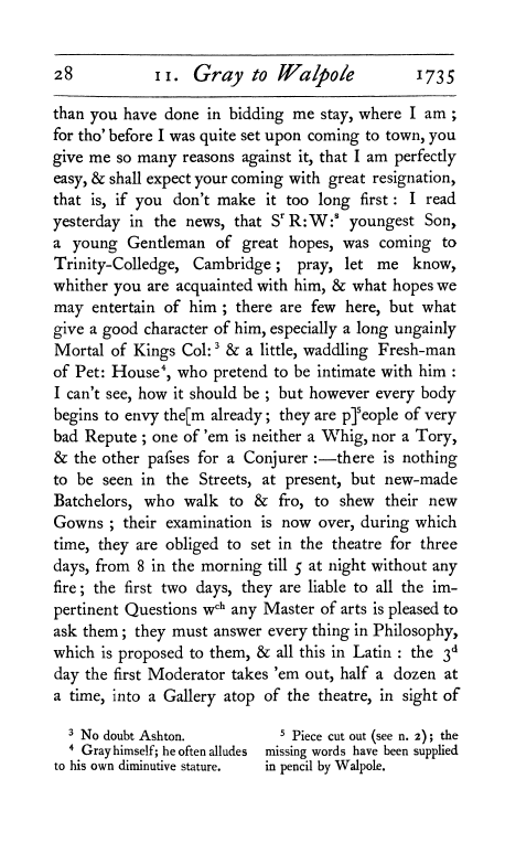 - The Correspondence of Gray, Walpole, West and Ashton (1734-1771), 2 vols. Chronologically arranged and edited with introduction, notes, and index by Paget Toynbee. Oxford: Clarendon Press, 1915, letter no. 11, vol. i, 27-29