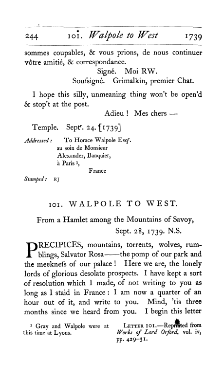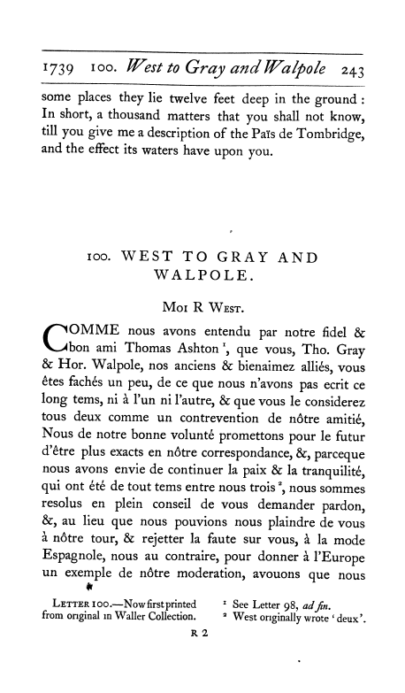 - The Correspondence of Gray, Walpole, West and Ashton (1734-1771), 2 vols. Chronologically arranged and edited with introduction, notes, and index by Paget Toynbee. Oxford: Clarendon Press, 1915, letter no. 100, vol. i, 243-244