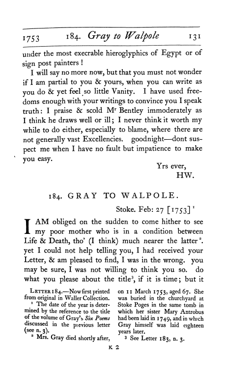 - The Correspondence of Gray, Walpole, West and Ashton (1734-1771), 2 vols. Chronologically arranged and edited with introduction, notes, and index by Paget Toynbee. Oxford: Clarendon Press, 1915, letter no. 184, vol. ii, 131-132