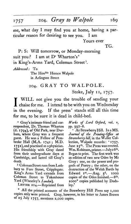 - The Correspondence of Gray, Walpole, West and Ashton (1734-1771), 2 vols. Chronologically arranged and edited with introduction, notes, and index by Paget Toynbee. Oxford: Clarendon Press, 1915, letter no. 203, vol. ii, 168-169