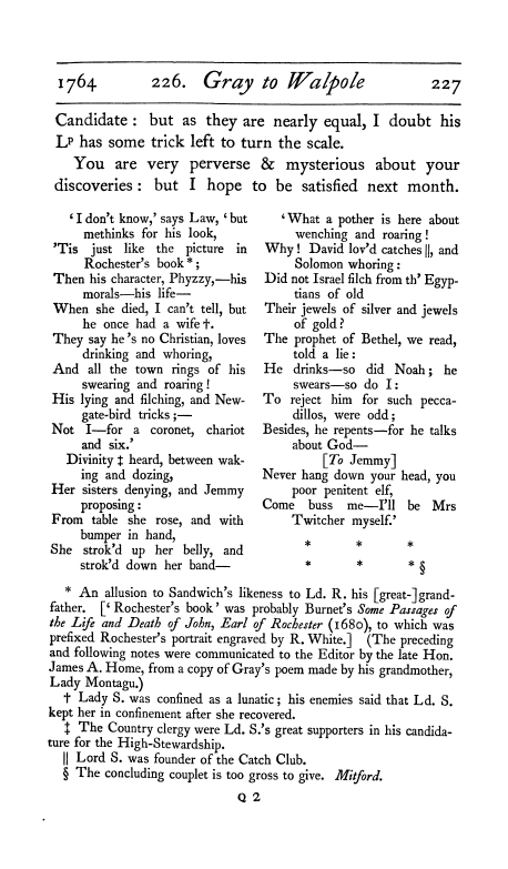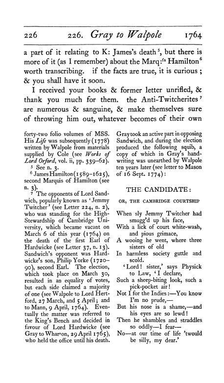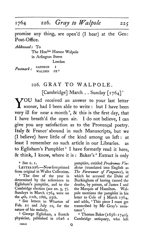 • The Correspondence of Gray, Walpole, West and Ashton (1734-1771), 2 vols. Chronologically arranged and edited with introduction, notes, and index by Paget Toynbee. Oxford: Clarendon Press, 1915, letter no. 226, vol. ii, 225-228