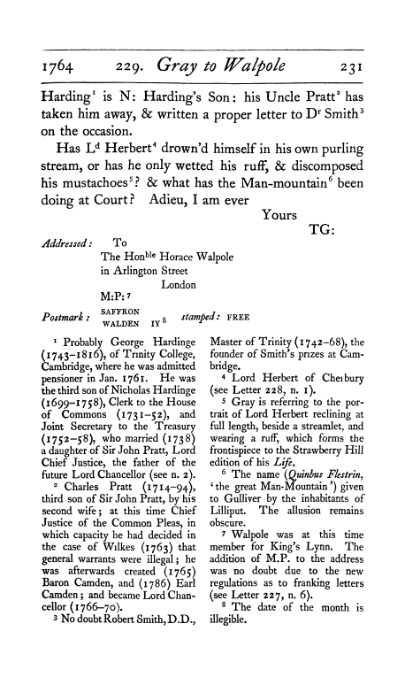 - The Correspondence of Gray, Walpole, West and Ashton (1734-1771), 2 vols. Chronologically arranged and edited with introduction, notes, and index by Paget Toynbee. Oxford: Clarendon Press, 1915, letter no. 229, vol. ii, 230-231